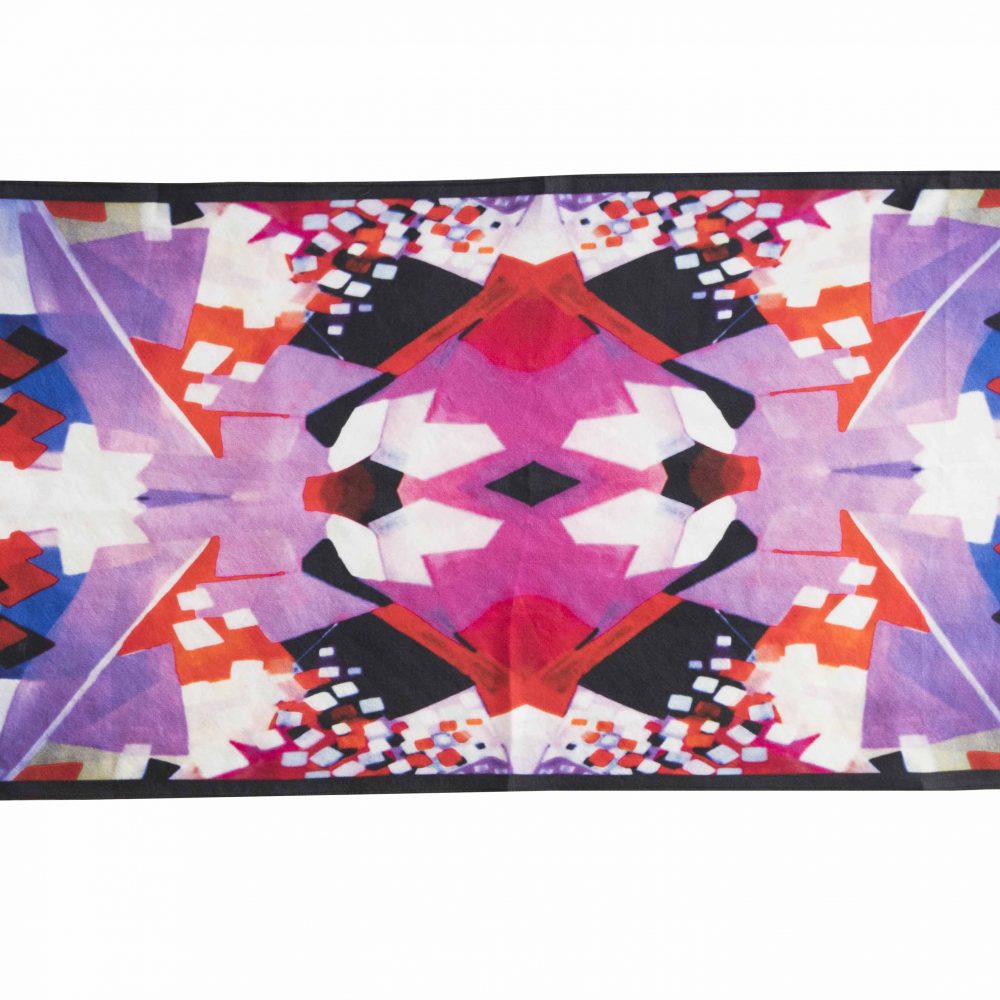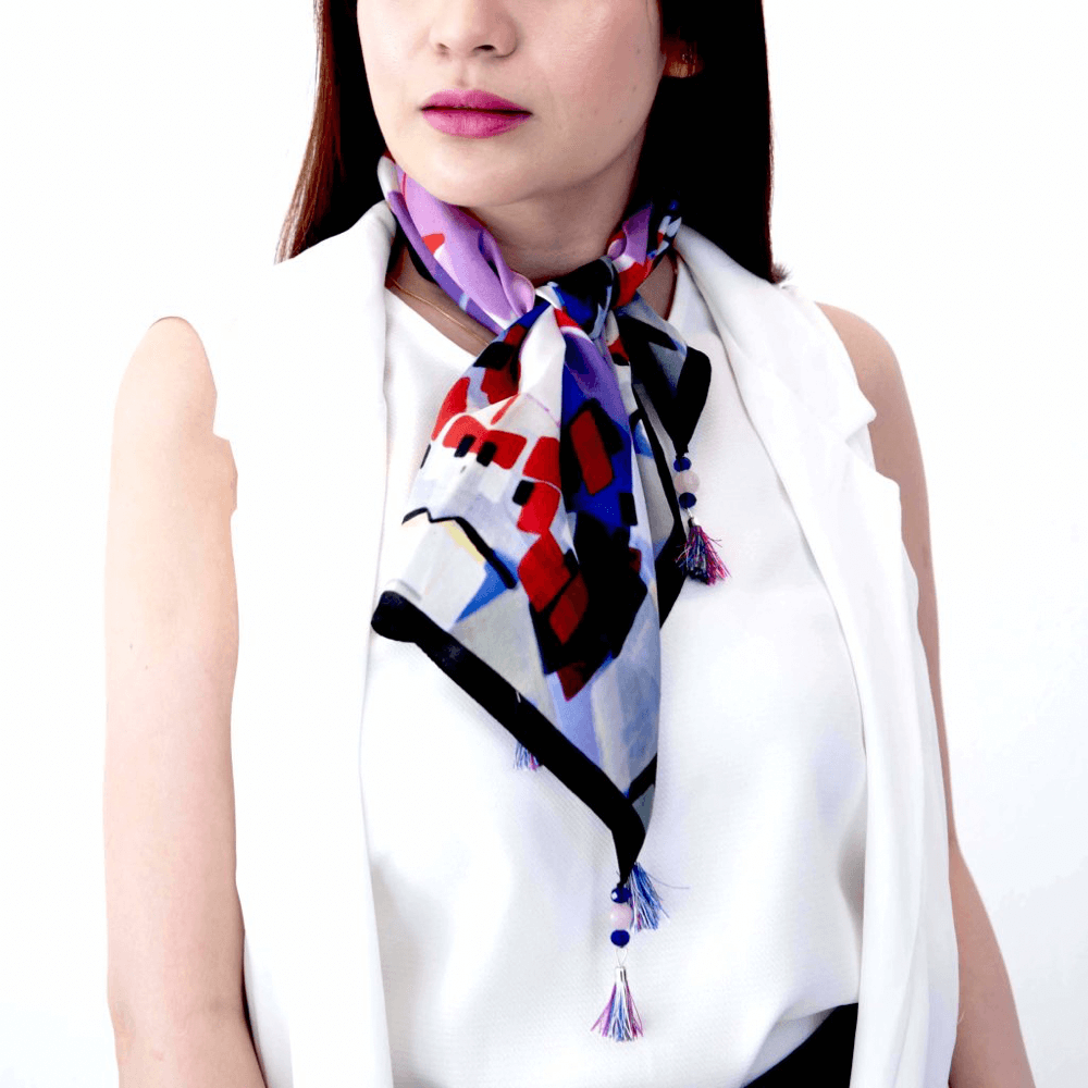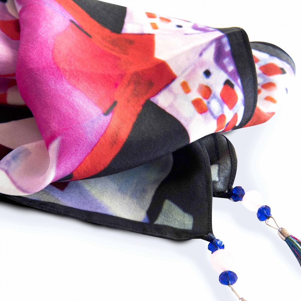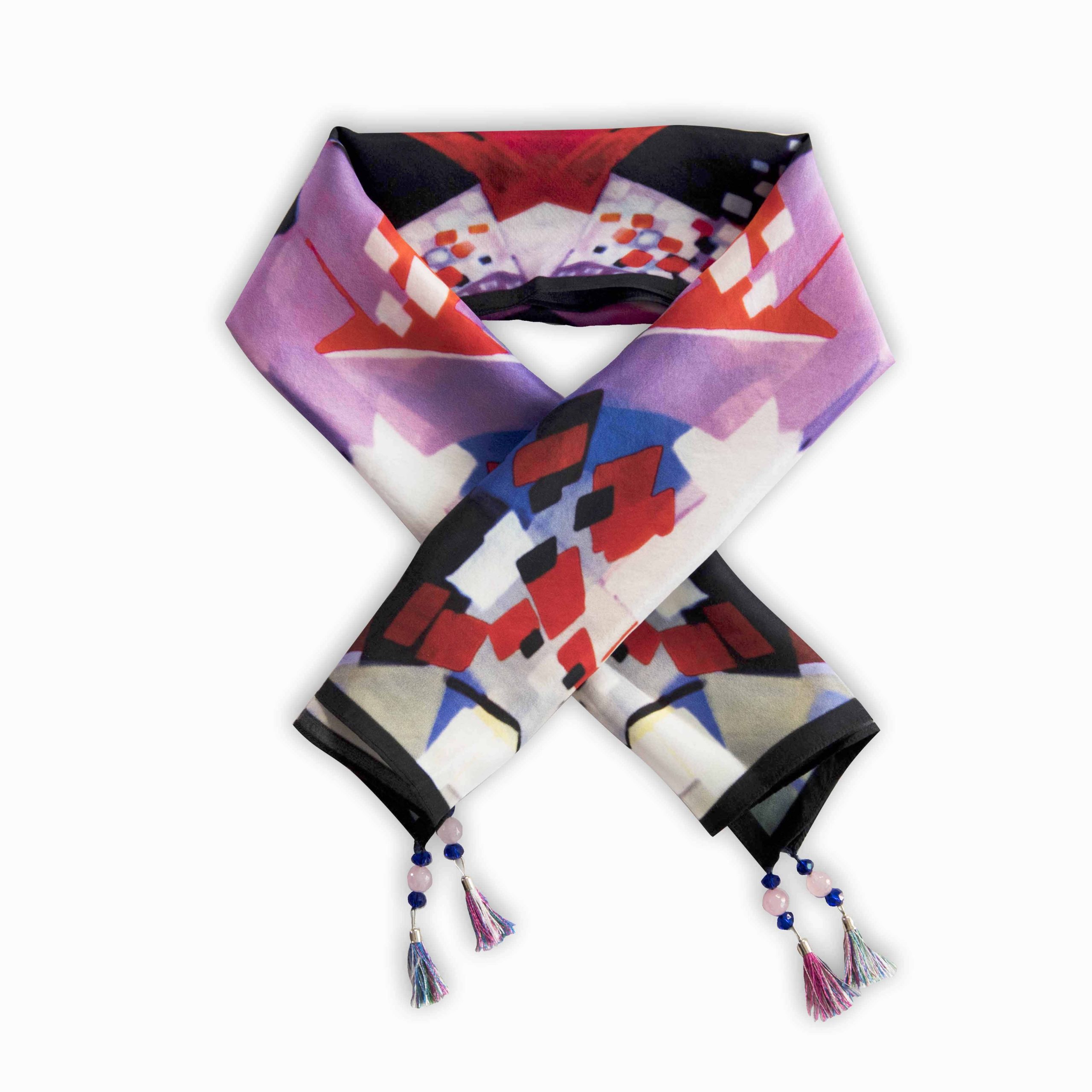 A multi-dimensional array of colors in the most contemporary and edgy artwork accented with beaded strings crafted to create a beautifully soft and lustrous piece of fabric that makes the perfect accessory.