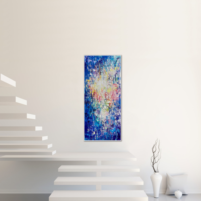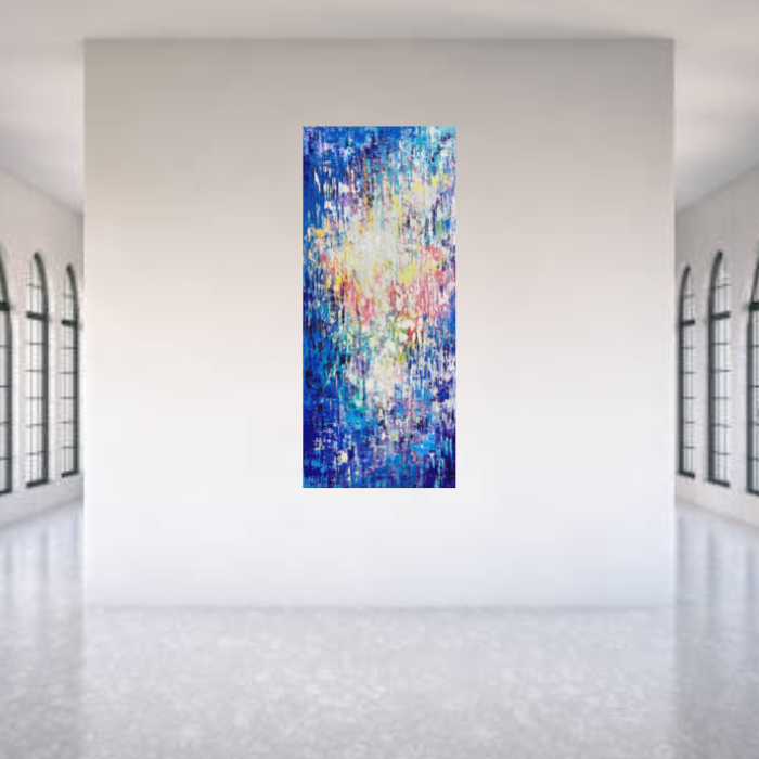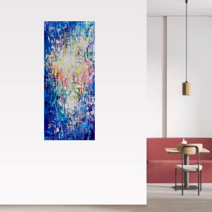 In this expressionist artwork, I’ve employed acrylics to channel a cascade of emotions through spontaneous, vigorous strokes. The chaotic interplay of colors—blues, whites, and dashes of warmer hues—reflects the tumultuous joy and complexity of happiness. When viewers bring this painting into their homes, it’s meant to ignite feelings of vitality and passion, a reminder of life’s dynamic beauty.