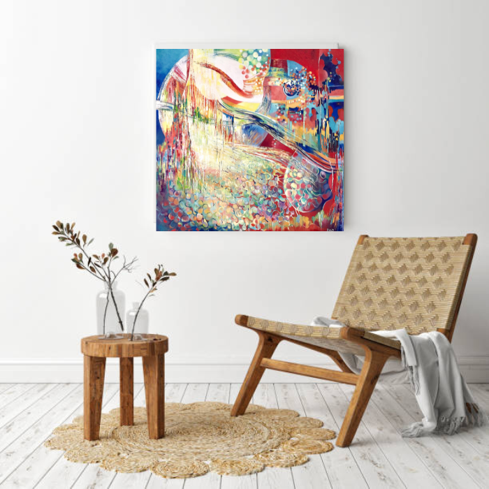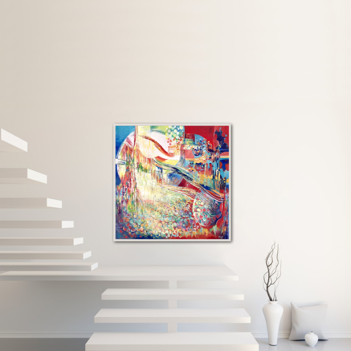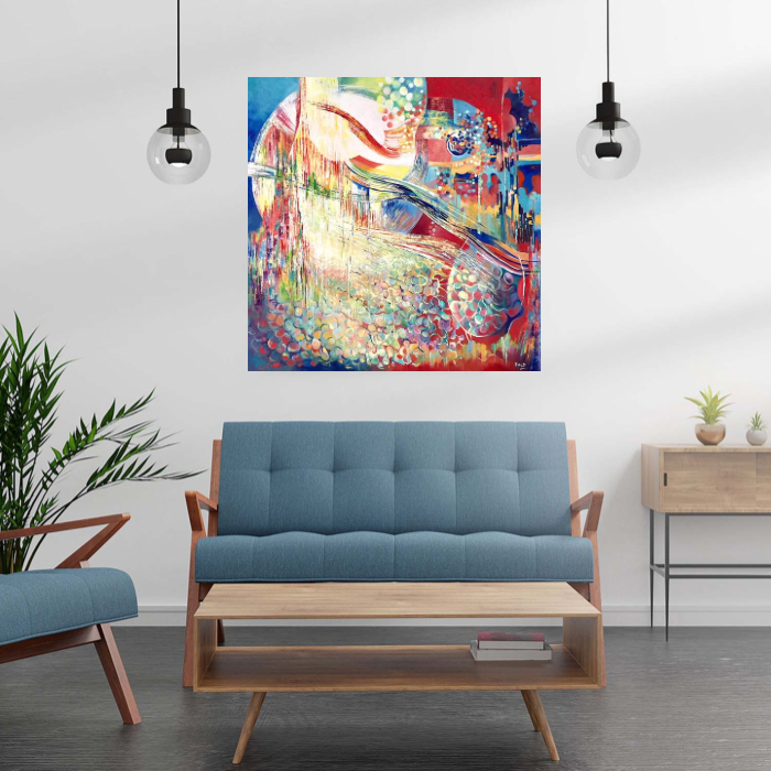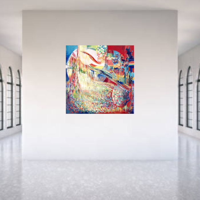 In this abstract oil piece, I channeled raw emotions of longing and a quest for connection, elegantly weaving colors and shapes to depict a turbulent yet hopeful journey. Its vibrant reds and calming blues symbolize the intense mix of longing and solace. This painting encapsulates the complex human desire to find a place in our vast, dynamic world, radiating energy that invites contemplation and courage in your space.
